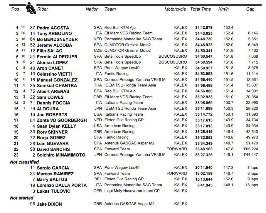 Per raccontare un gara così basterebbero due righe; quando due piloti scappano e s’inseguono per tutta la gara, in attesa del duello finale, in mezzo resterebbe ben poco da dire. Eppure... che tensione, che corsa, che sfida tra Pedro Acosta e Tony Arbolino. Perfetti entrambi soprattutto il milanese che ha azzeccato una partenza strepitosa mettendosi subito in testa alla gara con Acosta che può recriminare sulla sfollata iniziale che gli ha fatto perdere momentaneamente il comando. L’unica “divagazione” di una gara vissuta quasi unicamente sul duello tra i due leader del