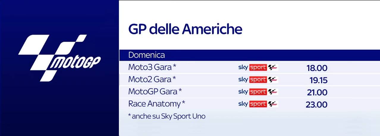 - Ore 21: gara MotoGP – in differita su TV8 dalle 23.05