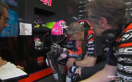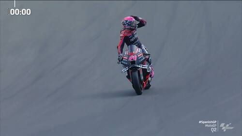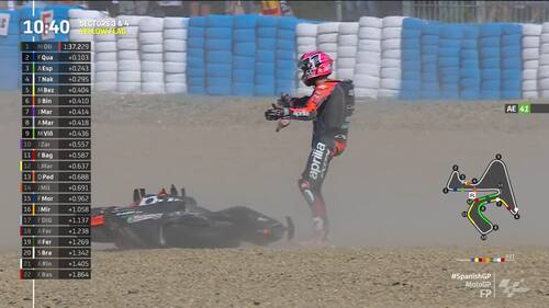 - Forse distratto dal gatto appena evitato, Aleix si sdraia tra il terzo e quarto settore: il pilota spagnolo vuole portare il prima possibile la sua moto preferita ai box in vista delle qualifiche e discute anche con i marshall nella concitazione del momento