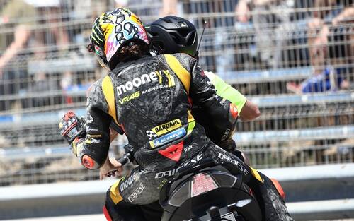 - Un incidente di gara classico che ha poi coinvolto l’incolpevole Bezzecchi che ha colpito una delle moto che scivolavano, tutto bene comunque e nuovo via con gara di soli 11 giri.