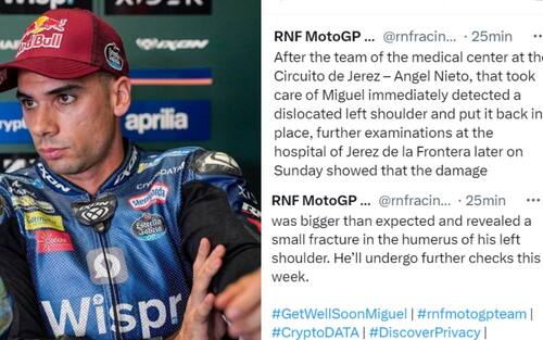 - Brutte notizie per Miguel Oliveira: come confermato dal team Aprilia RNF gli esami a cui si è sottoposto il portoghese dopo l'incidente con Quartararo hanno evidenziato una piccola frattura all'omero sinistro. Un infortunio più grave del previsto per lo sfortunato Oliveira, che aveva già saltato l'Argentina dopo l'incidente a Portimao con Marc Marquez