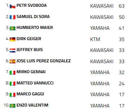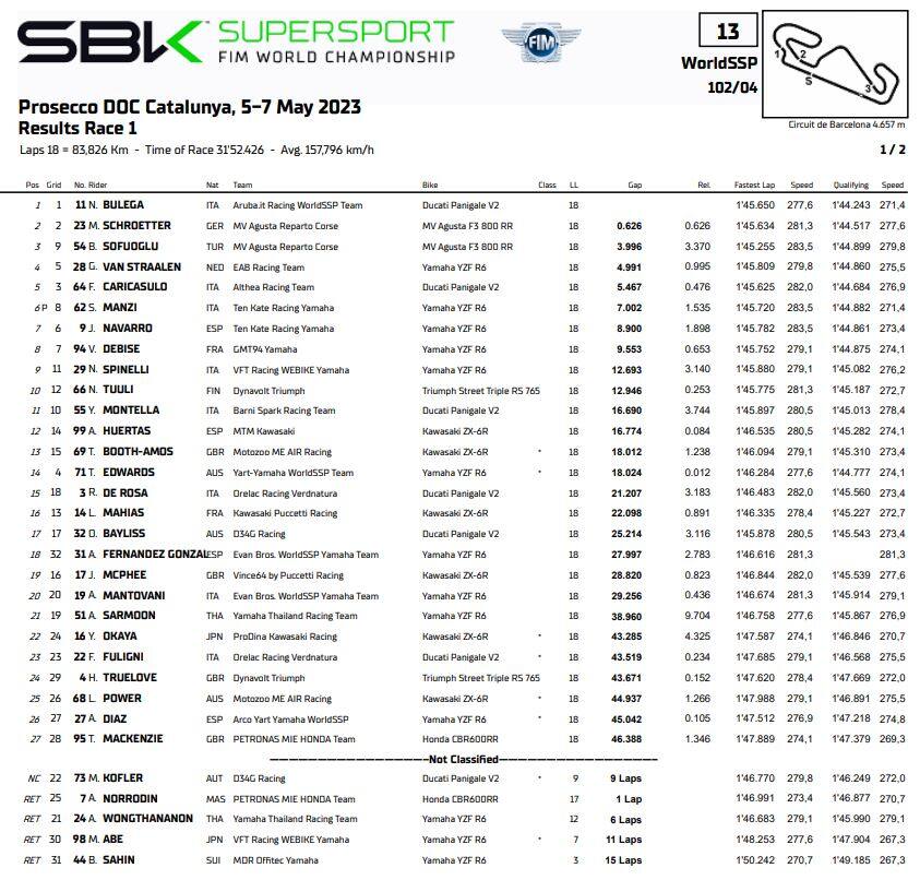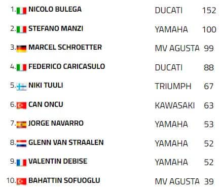 dalla prima staccata al traguardo. A spuntarla per soli sei millesimi è stato il turco, al primo podio in Supersport, mentre Manzi è retrocesso di altre due posizioni a causa di una discutibile penalità per taglio di chicane. Il quarto posto lo eredita Glenn Van Straalen che chiude davanti a Federico Caricasulo e, come detto, a Manzi. Jorge Navarro è settimo e precede Valentin Debise, con Nicholas Spinelli nono e Yari Montella undicesimo. In classifica, Bulega sale a cinquantadue punti di vantaggio su Manzi, che a sua volta ne ha uno su Schroetter.