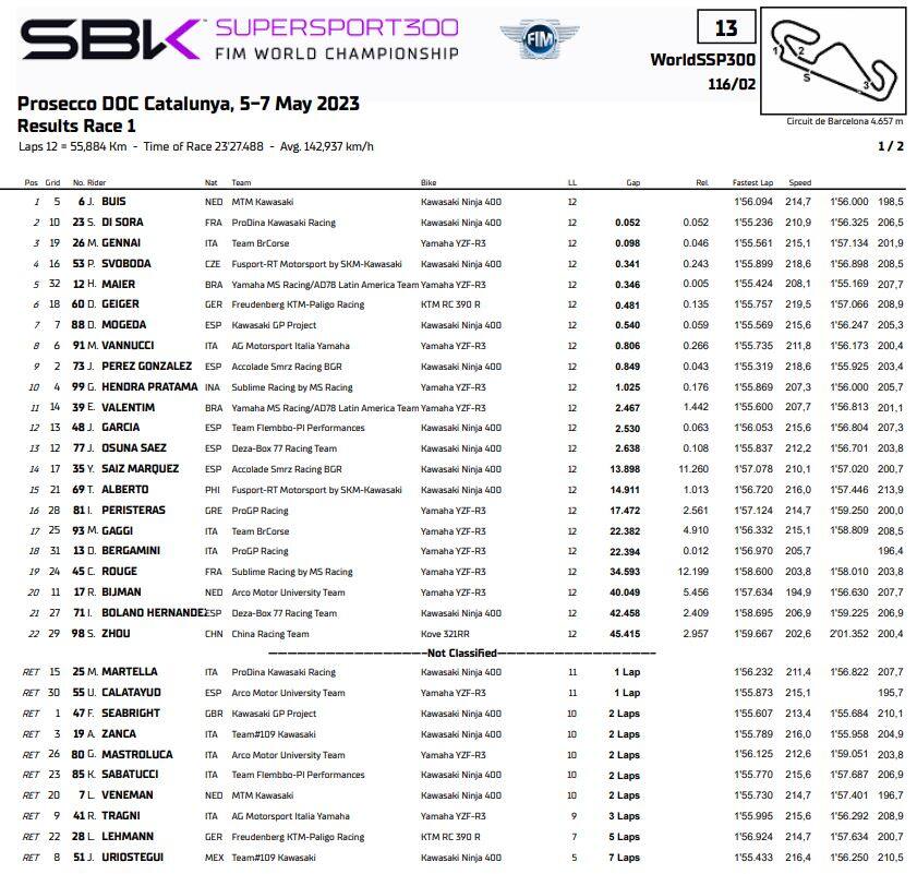 In Supersport 300 Jeffrey Buis torna alla vittoria dopo quasi due anni, spuntandola in una gara di gruppo su Samuel Di Sora e Mirko Gennai. Appena giù dal podio il leader di classifica Petr Svoboda seguito da Humberto Maier, partito ultimo per una penalità. Ottavo Matteo Vannucci.