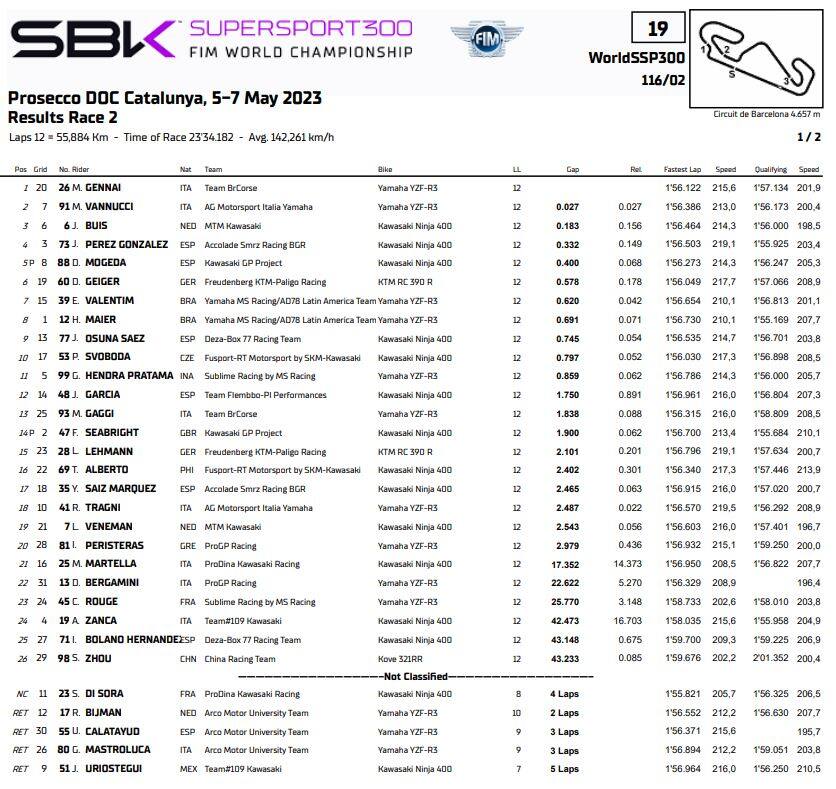 Due italiani davanti a tutti nella Supersport 300: Mirko Gennai ha superato all’ultima curva Matteo Vannucci cogliendo la seconda vittoria della carriera e conquistando il secondo posto in classifica. L’accoppiata toscana ha preceduto Jeffrey Buis, con gli spagnoli Daniel Mogeda e José Luis Perez Gonzales giù dal podio. Tredicesimo, a punti, Marco Gaggi.
