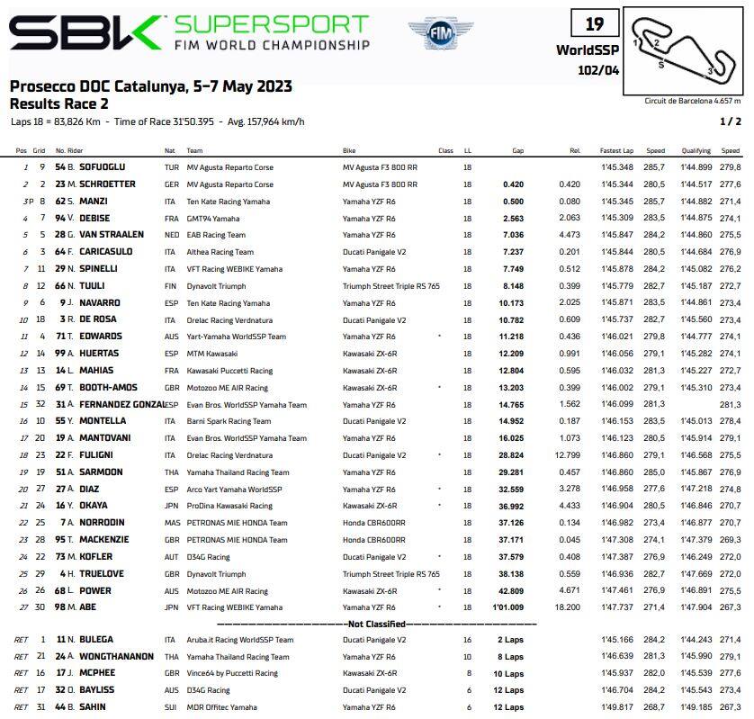 Ci era andato vicino in Gara 1, ce l’ha fatta in Gara 2: Bahattin Sofuoglu ha colto la sua prima vittoria nel mondiale Supersport completando un fine settimana da protagonista a Barcellona. Il turco di casa MV Agusta ha comandato buona parte della gara e ha condotto un ultimo giro magistrale per evitare il rientro di Stefano Manzi, con il quale aveva dato vita a un duello spettacolare nella gara di sabato. Proprio come in Gara 1, però, Manzi è stato penalizzato di una posizione per un millimetrico contatto con la zona verde oltre il cordolo all’ultimo giro. La seconda posizione è passata così a Marcel Schroetter, che bissando il risultato della prima corsa sale al secondo posto in campionato. Il capoclassifica Nicolò Bulega, invece, ha visto le sue chance di podio sfumare a causa di un problema tecnico al penultimo giro. Giù dal podio le Yamaha di Valentin Debise e Glenn Van Straalen, con Federico Caricasulo sesto e prima Ducati al traguardo. Buon settimo posto per Nicholas Spinelli davanti a Niki Tuuli, mentre Jorge Navarro e Raffaele De Rosa hanno conquistato la top-10. Sedicesimo Yari Montella, seguito da Andrea Mantovani e Federico Fuligni.
