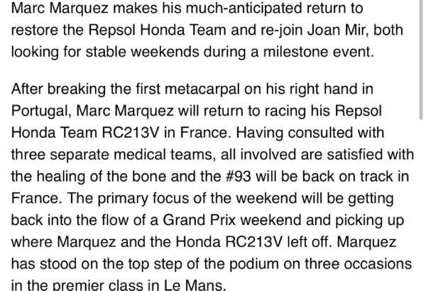 Lo spagnolo di sarà nel fine settimana in Francia. Le condizioni della mano destra dopo la caduta da lui stesso provocata a Portimao gli consentiranno di partecipare dopo l’ok dei medici. Ieri anche la decisione della Corte d'Appllo FIM: che ha considerato estinta la sanzione a carico del pilota dopo l'episodio in Portogallo