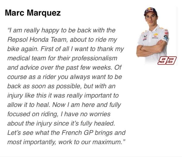 Intanto però è risolta la diatriba relativa alla penalità da scontare a seguito della caduta innescata a Portimao, al quale era seguito l'obbligo di "doppio long lap penalty". Marquez infatti potrà correre il GP francese senza scontare la sanzione scaturita in Portogallo. La Corte d'Appello MotoGP della Fim ha considerato estinta la Double Long Lap Penalty inflitta allo spagnolo dal Fim MotoGP, Stewards Panel, durante la gara del 26 marzo 2023. In sostanta la Corte ha ritenuto che sia stata che sia stata applicata nonostante la mancata partecipazioe al GP dell'Argentina". Marc Marquez è quindi autorizzato a partecipare alla prossima gara senza ulteriori sanzioni.