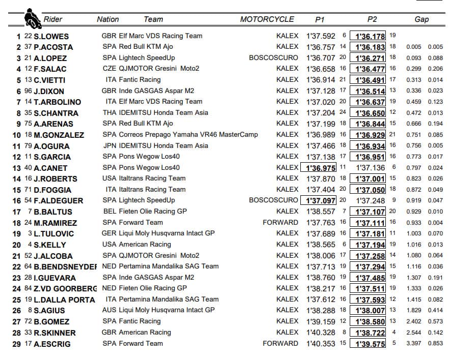 Vincitore in Spagna, Sam Lowes è ripartito alla grande in Francia, stampando il miglior tempo nella prima giornata di prove. L’inglese ha scavalcato nella graduatoria combinata dei tempi, per soli 5 millesimi, il leader del mondiale Acosta, in gran forma a dire il vero, capace di segnare e ribassare tempi significati per tutto il turno, sintomo di grande costanza (il lungo alla 8, nel tentativo di ritoccare il miglior tempo in quel momento già suo significa poco). Arbolino ha cercato per oltre mezzo turno di stare insieme allo spagnolo, ma ha poi dovuto arrendersi anche ad Alonso Lopez, scivolato causa perdita d’anteriore alla curva 7 prima di acchiappare nel finale la prima fila virtuale col terzo miglior crono. Quindi Filip Salac, e Celestino Vietti con il quinto tempo. A dispetto di qualche difficoltà sul posteriore, il piemontese della Fantic ha sorpreso tutti.