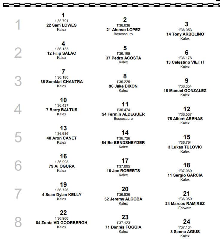 Quarto posto per Filip Salac, partito bene fin dalle prove di venerdì, con le insegne del team Gresini, sesto un ritrovato Celestino Vietti, solitamente non velocissimo in qualifica. Il pilota della debuttante Fantic manca ancora di costanza ma per la gara di domenica sembra messo meglio del solito. Settimo Chantra (il più veloce nelle libere del mattino con l’asfalto un po’ umido) pilota le cui quotazioni crescono sugli asfalti bagnati (ma per domenica il meteo tende al sereno).