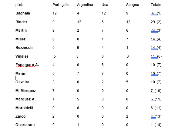 Nella Sprint serve partire forte e dare tutto fin dalle prime curve. Bagnaia in qualche caso ha gestito, ma sempre con il podio nel mirino. Altrettanto convincente il sudafricano della Ktm con due vittorie e uno solo zero a consuntivo. Binder insegue Bagnaia nel “mundialito” del sabato staccato di 8 lunghezze. Alle sue spalle lo spagnolo della Pramac Ducati, Martin, che ha messo a frutto la sua velocità soprattutto nelle gare veloci che gli hanno garantito gli unici due podi conquistati nei quattro week end di gara, ed è anche il più costante con Bagnaia, sempre a punti in tutte le occasioni. Col quarto posto (un podio in Spagna) Jack Miller, ha rafforzato la stessa posizione nella graduatoria iridata, subito dietro il compagno di squadra Binder. Un podio a testa anche per i due piloti della VR46, Bezzecchi e Marini, nella medesima corsa, a Termas de Rio Hondo.