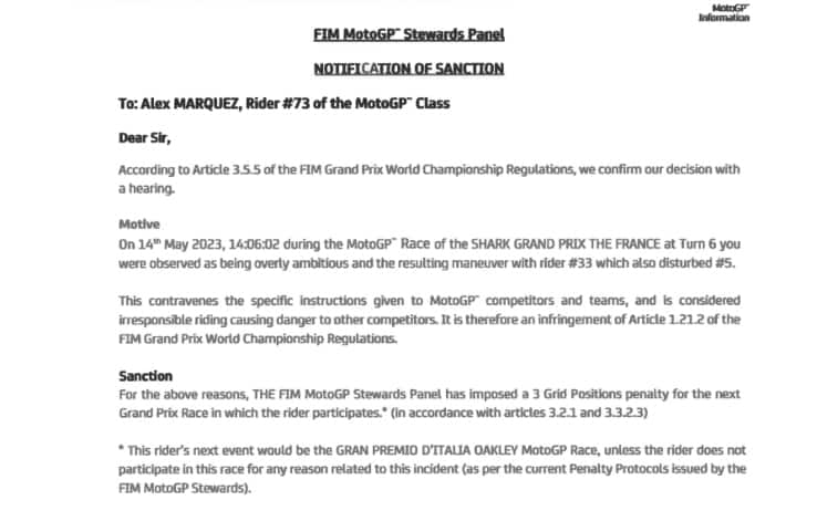 AL MUGELLOGP di Francia da dimenticare per Alex Marquez: il pilota del team Gresini, uscito di scena (senza colpe) al quinto giro di Le Mans per un incidente con Luca Marini, ha subito una penalità da scontare nel suo prossimo Gran Premio utile. Che, a meno di forfait, sarà quello del Mugello. Lo spagnolo è stato punito con una retrocessione di tre posizioni in griglia per un'entrata su Brad Binder, poi finito largo, a inizio gara. Coinvolto nell'occasione anche Zarco