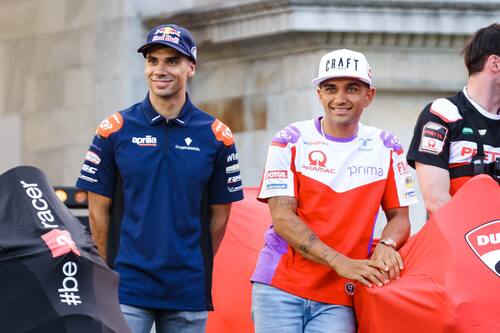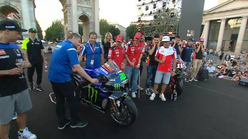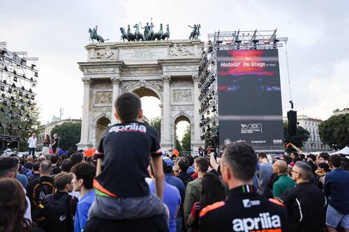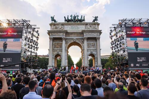 Grande entusiasmo all'Arco della Pace di Milano per "MotoGP On Stage", l'evento presentato da Guido Meda insieme con Linus in vista del GP Italia del weekend al Mugello. Sul palco sono saliti 13 piloti (tra cui Bagnaia, Bezzecchi e Bastianini), che hanno raccontato aneddoti e curiosità dentro e fuori la pista. Spettacolo, gag e anche il concerto finale: la Yamaha di Morbidelli e l'Aprilia di Vinales sono state accese per un rombo di motori in stile griglia di partenza