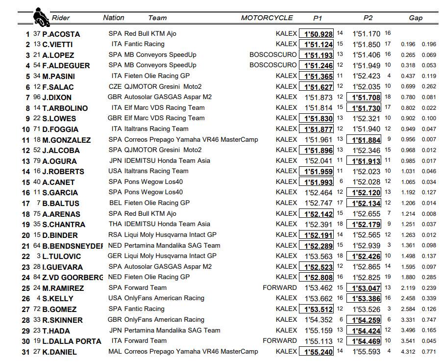 Ben tornato Pedro. Acosta si presenta col miglior tempo, staccato al mattino e rimasto imbattuto al pomeriggio. Lo spagnolo deve cancellare il ricordo dello zero in Francia e soprattutto accorciare lo svantaggio di 25 punti in classifica dal leader del mondiale Tony Arbolino (ottavo nel primo giorno di lbere). La sfida di cartellone per ora è tutta lì, tra i due protaginisti da inizio campionato, lo spagnolo che aveva
