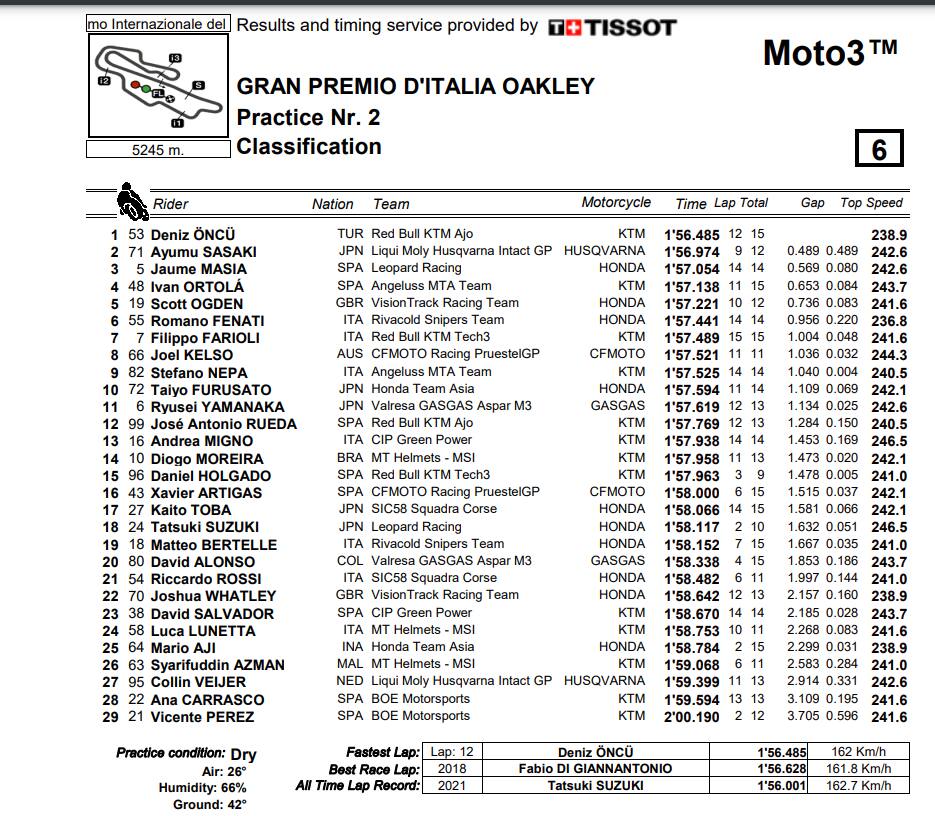 Mettersi al riparo dalla pioggia e dall’incertezza di una FP3 che potrebbe rivelarsi inutile al fine di centrare le qualifiche di sabato pomeriggio. Il secondo turno del venerdì ha obbligato piloti e squadre a concentrarsi più del solito sul cronometro, nel timore di trovare la pista bagnata il giorno dopo. La classifica della prima giornata di Libere potrebbe rivelarsi decisiva per garantirsi un posto nella top 14. Buone notizie quindi per Deniz Oncu, che ha chiuso la giornata davanti a tutti. Il turco ha sfruttao bene la velocità della sua Ktm sul tracciato toscano dove le scie giocano comunque un ruolo importante. Alle sue spalle Sasaki, pilota tra i più rapidi, quindi Masia che si è difeso egregiamente con la sua Honda. Ortola ha agguantao il quarto tempo, per la felicità del Team Angeluss che ha fatto il “pieno” con Nepa in nona posizone. Il migliore degli italiani è stato però il buon Fenati, sull’impegnativo tracciato toscano. Il sesto posto rilancia le sue quotazioni per le qualifiche.