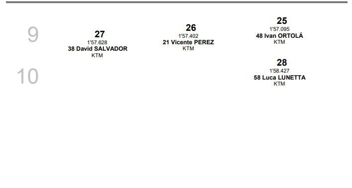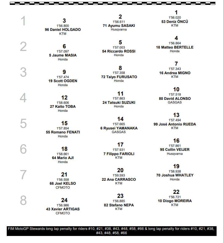 La pole position l’ha conquistata Deniz Oncu (girando quasi tutto il turno da solo e fermandosi a un soffio dal record della pista), e almeno la sua posizione è certa. Il resto della griglia è invece da ricostruire, causa penalizzazioni che hanno colpito ben 8 piloti, spedendoli tutti in fondo allo schieramento. Nepa, Salvador, Perez, Lunetta, Kelso, Moreira, Artigas e Ortola i loro nomi. Guida irresponsabile recita la nota diffusa della Dorna. Ortola il nome più illustre a farne le spese, lo spagnolo in lotta per il titolo con Holgado, dovrà quindi scivolare più indietro dalla quarta fila con cui aveva chiuso la sua qualifica, a due file dal suo avversario diretto. Maggior scorno per Joe Kelso, finito in prima fila a fianco del turco della Ktm. Dietro anche lui, come Moreira (quarto tempo) uno che in campionato occupa il quarto posto, subito davanti a Artigas.