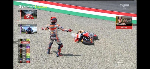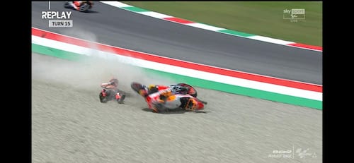 - 18 giri alla fine del GP d'Italia. Marc Marquez è protagonista di un'ottima gara, è in zona podio. In Curva 15 (Bucine), però, lo spagnolo perde il controllo della sua HRC e finisce nella ghiaia. Termina così il suo weekend del Mugello, dove incassa la 4^ caduta di fila, la terza della stagione. Poi sfoga tutta la rabbia e la frustrazione, prima di tornare al box. Ecco la fotosequenza della caduta