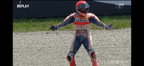Marc Marquez ha chiuso in anticipo il suo GP d'Italia: il pilota della Honda è finito nella ghiaia a 18 giri dalla fine alla Bucine mentre era 4° e poi si è arrabbiato allargando le braccia: "Ho commesso un errore, ma questa moto è difficile da capire: siamo troppo al limite"