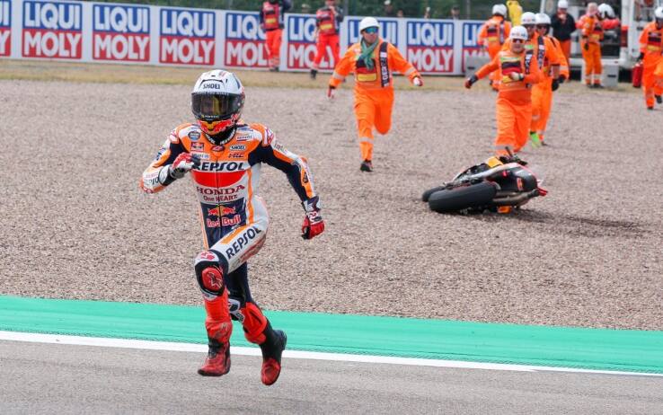 Marquez in Olanda, ci sarà. Non si ferma, tira ancora, anche a valle di uno dei suoi peggiori weekend di sempre. Risponde con la presenza a chi lo immaginava sconfitto dal feroce Sachsenring, un tempo a lui così caro, così amico. La Germania era per lui l’occasione per tirare il fiato, finalmente, in un cammino che è difficilissimo; era alta l’aspettativa per lui, per tutti, stante che lì di norma, ha sempre vinto, anche quando si trattava di tappare i vuoti tecnici della sua Honda con i pieni del suo talento sconfinato. Stavolta - per dire dei vuoti tecnici - non è più bastato. Dopo cinque cadute, dando onestamente il massimo e rendendosi pericoloso al limite solo per se stesso, ha alzato bandiera bianca.
