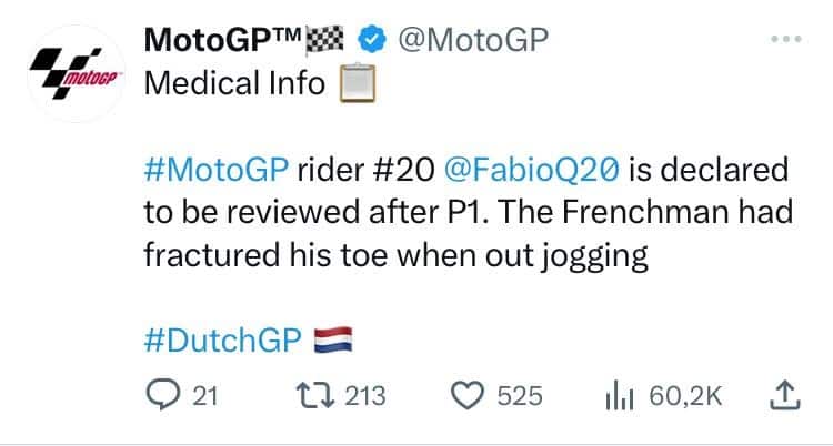 MotoGpPiccola disavventura per Fabio Quartararo, che complica ulteriormente la sua stagione già difficile. Il francese della Yamaha è caduto in allenamento, subendo un duro colpo al piede sinistro: mentre faceva jogging ad Amsterdam, ha riportato una distorsione alla caviglia sinistra e la frattura dell'alluce sinistro. L'account della MotoGP conferma che sarà sottoposto a un nuovo controllo medico dopo le Libere 1 per valutare le sue condizioni fisiche