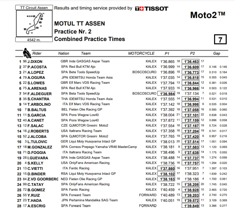Tra Tony e Pedro il primo round è andato allo spagnolo. Acosta, a lungo alle spalle dell’italiano, ha cambiato passo negli ultimi dieci minuti della FP2 firmando un bel giro che lo ha messo alle spalle di un super Dixon. Arbolino ha provato più volte ad abbassare il tempo, soprattutto per tenere il mirino l’avversario diretto in campionato, ma il milanese deve assolutamente migliorare gli ultimi due settori della pista olandese dove perde mediamente un paio di decimi. Per ora Pedro sembra più a punto, ma i pronostici sono molto condizionati da quello che faranno i loro avversari. Dixon ha un passo indiavolato, e sembra in grado di prenotarsi un posto da protagonista fin d’ora per le qualifiche di sabato, dove sarà da tenere d’occhio anche Alfonso Lopez, partito col piede giusto. Il duello al vertice potrebbe quindi allargarsi ad altri avversari della coppia del momento, che nelle ultime gare ha monopolizzato le prime posizioni del podio (due volte primo Acosta davanti ad Arbolino). Tra le conferme, Ai Ogura quarto, Sam Lowes quinto, Arenas sesto, Aldeguer settimo (sono partiti entrambe forte i piloti di Luca Boscoscuro) e Somkiat Chantra ottavo, proprio davanti ad Arbolino. Tra le delusioni della prima giornata, Aron Canet che ha faticato parecchio per entrare nella top quindici (dodicesimo infine lo spagnolo) e Filip Salac finito alle sue spalle. Dennis Foggia, ancora una volta partito di rincorsa, ha chiuso col diciottesimo tempo, comunque meglio di Celestino Vietti, ventunesimo e pure caduto, per fortuna senza conseguenze.