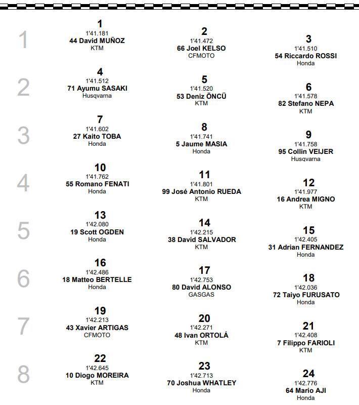 Una griglia capovolta, con Holgado, leader del mondiale, finito in ultima fila e Munoz davanti a tutti. Il doppio turno di venerdì aveva inviato segnali preoccupanti, con molti big destinati alla Q1 dopo una giornata di libere complicata dalle condizioni della pista. Risultato. Holgado, Oncu, Ortolà e Moreria, tutti protagonisti della lotta al vertici, sono finiti in Q1, dove la situazione per molti di loro non è migliorata. Anzi… A Daniel Holgado è stato cancellato l’ultimo giro, quello buono, e si è così ritrovato con il peggior tempo di tutti. In compagnia di Ortolà, condizionato da un problema tecnico, e Moreira. Solo Oncu si è salvato in un sabato che sarà ricordato a lungo. Nemmeno Sasaki ha saputo approfittare della inattesa difficoltà dei suoi avversari nel mondiale; il giapponese dopo una momentanea felicità per aver staccato la pole virtuale ha dovuto cedere il passo allo spagnolo bravo a sfruttare la scia di Masia (poi caduto) per centrare la sua prima pole in carriera.