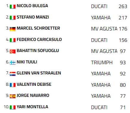 La direzione di gara non ha penalizzato Manzi per la manovra, decisione che ha sorpreso in primis il pilota stesso. Alla luce di quanto mostrato in prova, Caricasulo era il grande favorito per questa gara e senza di lui Manzi è stato ingiocabile. La sua fuga ha piegato la resistenza di Marcel Schroetter e Nicolò Bulega, secondo e terzo. Con questo risultato Manzi recupera nove punti sul Ducatista e scende a quarantasei lunghezze di distacco in classifica, mentre Schroetter va a +20 su Caricasulo per il terzo posto.