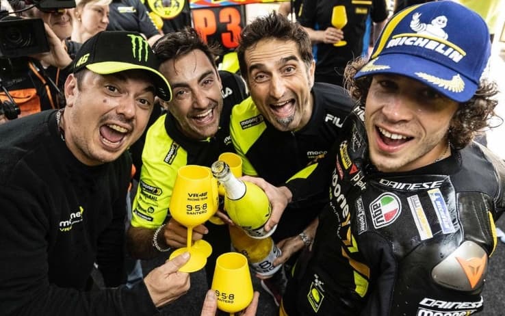 "Sì, allora ero io, poi, nel 2021, parlavamo di fare il team con Sky ed ero il manager di Vietti, Migno, Bezzecchi e Marini. Troppo, non sapevo come fare a dare il resto… Ero veramente in difficoltà, perché avevo troppe cose da fare e soprattutto non mi piaceva l’dea di fare il responsabile del team ed essere allo stesso tempo il manager dei piloti. Era una cosa che avrebbe potuto anche andare bene, ma al massimo fino alla Moto2. Noi vogliamo e dobbiamo crescere e io quando andavo a letto non mi sentivo di aver fatto un lavoro al meglio per tutti, perché è difficile giocare al meglio con due maglie. Non era così facile, i ragazzi si fidavano di noi, stavamo crescendo. Così ci siamo seduti a un tavolino e ci siamo divisi i ruoli, finalmente direi, perché è una cosa che ha migliorato tutto in un momento delicato. Quest’anno abbiamo fatto un altro step proprio perché io seguo soltanto il team e Carlo segue soltanto l’Academy. Naturalmente lavoriamo sempre per una persona, stiamo insieme, condividiamo tutto eccetera, però ognuno fa il suo. Carlo, che è bravissimo e in questi anni è cresciuto molto sia a livello di preparazione fisica, ma anche manageriale. Così Vale a lui ha dato la responsabilità dell’Academy e a me ha dato il team, mi ha lasciato lì. Poi Carlo ha preso un’altra persona, Francesco Secchiaroli, un suo amico di Pesaro, per fare il manager di Marini, Bezzecchi e di Vietti. È un ragazzo che ha voglia, si impegna, ed è bravissimo, un’altra scommessa vinta, soprattutto perché non è uno del nostro mondo"
