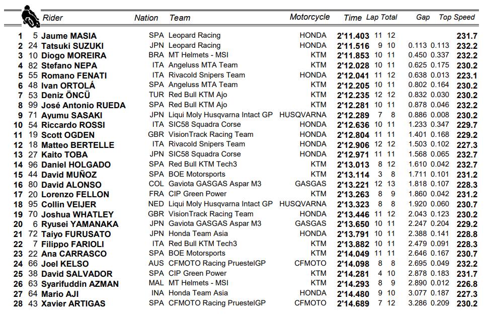 Torna in pista la Moto 3, con qualche conferme e diverse sorprese. Tra le prime spicca Jaume Masia, secondo in campionato, che ha staccato il miglior tempo di giornata, davanti al compagno di squadra in Leopard Tatsu Suzuki recuperato dalla doppia frattura a mano e piedi che gli è costata la rinuncia degli ultimi due gran premi. Due Honda davanti sono la prima sorpresa, ma forse colpisce di più, in negativo, il quattordicesimo tempo del leader del mondiale Daniel Holgado, partito in sordina. Tra le note positivi risalta anche il quarto crono di Stefano Nepa, primo degli