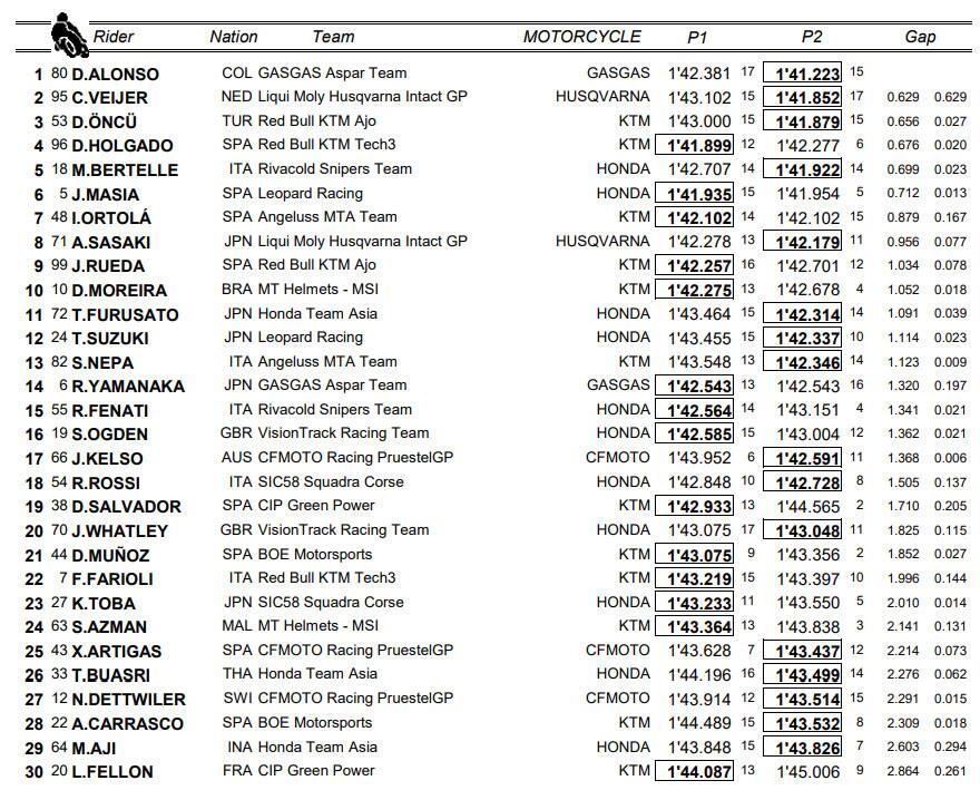momento, Romano Fenati protagonista di una buona sessione mattutina a cui non ha però potuto dare continuità al pomeriggio, a causa di un problema tecnico. Da rivedere sabato mattina anche Riccardo Rossi, diciottesimo, Filippo Farioli, ventiduesimo e anche Kaito Toba, addirittura ventitreesimo.