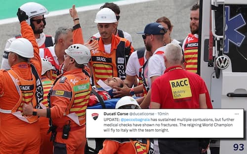 - "Bagnaia ha riportato molteplici contusioni, ma gli ulteriori accertamenti medici non hanno evidenziato fratture. Il Campione del Mondo in carica volerà stasera in Italia con la squadra"