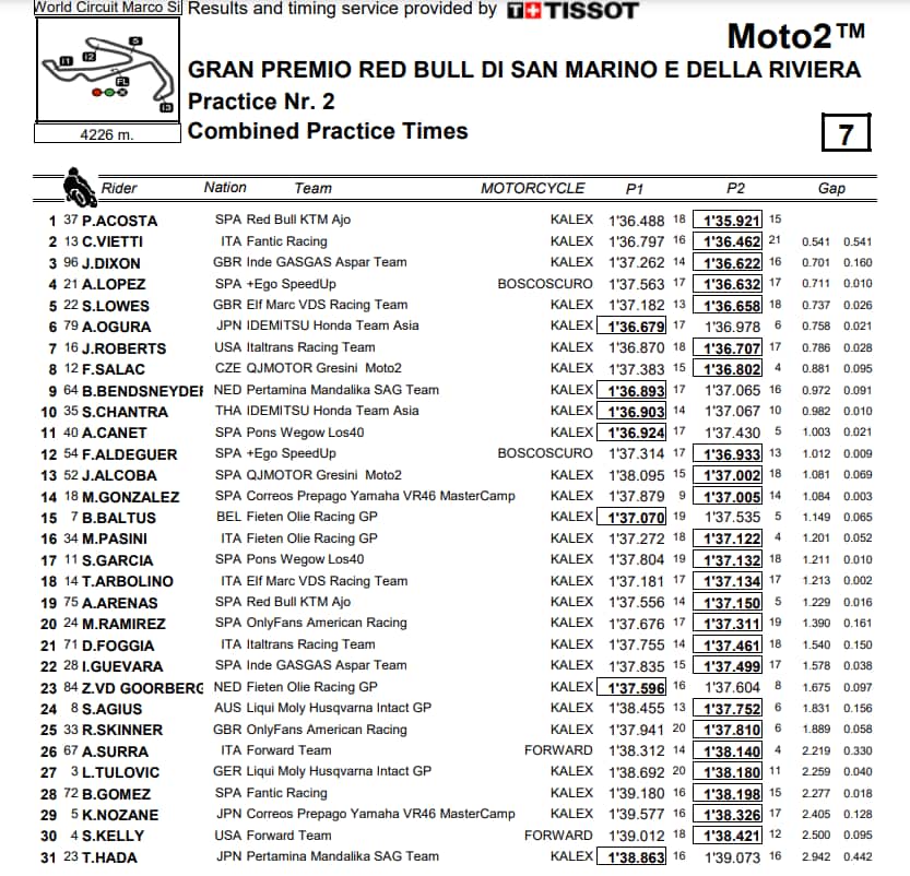 Davanti fanno un altro sport: pericoloso Dixon, reduce dal successo a Barcellona, col terzo tempo a un decimo da Vietti, e Lopez che ha migliorato i tempi del mattino, classificandosi al quarto posto a fine giornata. Caduto Canet, due volte Arenas (una volta al mattino, la seconda al pomeriggio), fuori gioco a lungo Ogura per problemi tecnici (ma alla fine il giapponese ha firmato il sesto tempo), nemmeno Mattia Pasini è riuscito a confermarsi in FP2 dopo il buon avvio in FP1. Il romagnolo, tornato in gara per questa occasione, per ora è sedicesimo.