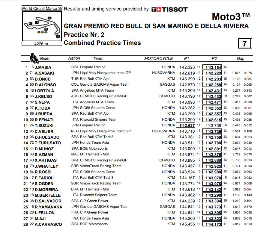 Oltretutto Holgado deve fare i conti sistematicamente anche con Oncu (terzo nella prima giornata di prove a Misano), l’esordiente Alonso, spettacolare vincitore dell’ultimo gran premio, e Ortolá, che tra alti e bassi occupa il quinto posto nel mondiale. Migliore degli italiani, Stefano Nepa, settimo, Romano Fenati ancora una volta ha centrato la top ten in prova (peccato raccolga di meno in gara il marchigiano), mentre Riccardo Rossi, diciassettesimo al mattino, ha chiuso due posizioni più indietro la sua giornata.