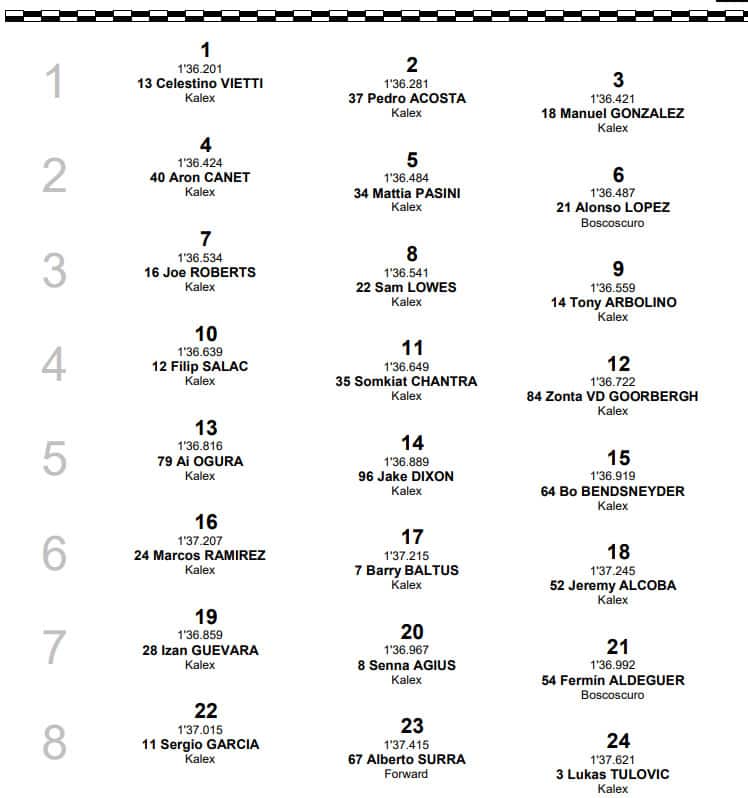 Seconda pole della stagione per Vietti, uno vero smacco per Acosta. Celestino, partito in quarta sabato mattina, staccando il miglior tempo in Fp3, s’è ripetuto in qualifica. Sarà l’aria di casa, il circuito amico (qui si allena con gli amici dell’Academy), nel pomeriggio ha migliorato ancora. Una prestazione solida come ha detto Mariano Roman amministratore delegato di Fantic, soprattuto un primo segno di quella costanza che finora gli è mancata. Acosta, l’unico che non ha ritoccato il tempo la mattina, ha comunque ritrovato la velocità in qualifica. All’ultimo giro aveva in mano la possibile pole, ma ha mollato al secondo intertempo. Partirà secondo e sarà un osso duro per il piemontese (“ma possiamo giocarcela” la previsione di Vietti per domenica).