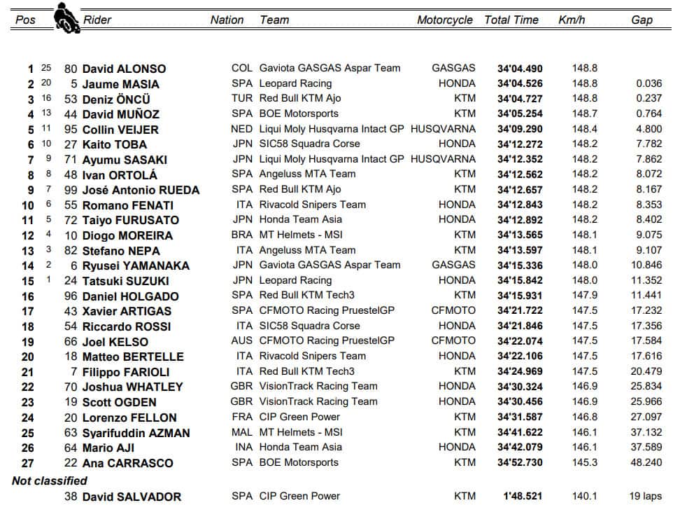 Alonso, ha infilato lui e il turco in un colpo solo. Con sicurezza e lucidità. Cinico e spietato, come in Spagna, un talento precoce che può solo maturare. Difficilmente sbaglia David: terza vittoria in quattro gare, in classifica si porta a 21 punti da Holgado, in crisi, ancora una volta a zero punti. Il leader del mondiale non vince dal Mugello e il suo vantaggio s’è ridotto a 4 punti su Sasaki, il cui rimpianto è solo un po’ più piccolo. Il giapponese partito bene dalla seconda posizione, ha corso col gruppo dei primi per metà gara, salvo staccarsi dopo essere stato superato da Toba. Ha chiuso settimo, superato anche dal giovane compagno di squadra Veijer, portandosi a casa sette punti, un bottino esiguo viste le premesse. Il mondiale è più aperto che mai, sei piloti in 29 punti. Munoz, rimasto coi primi per tutta la corsa, si è fermato ai piedi del podio. Ortolà, scattato dal tredicesimo posto, è finito in ottava posizione. Decimo Romano Fenati, primo degli italiani, a punti come Stefano Nepa, tredicesimo. Riccardo Rossi, diciottesimo, ha fatto solo un po’ meglio di Filippo Farioli, diciannovesimo, e Mattia Bertelle, ventunesimo.