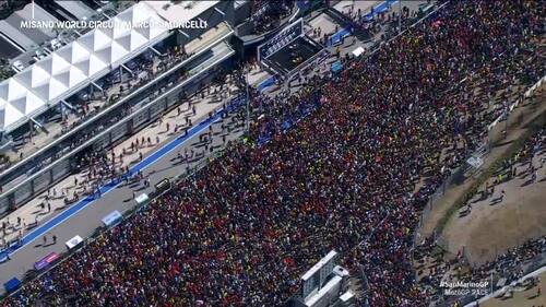 Straordinario spettacolo di pubblico a Misano, dove oltre 140mila persone hanno affollato il Circuito Marco Simoncelli nel weekend del motomondiale. L'apice sotto il podio della gara di MotoGP, dove si è vista la 'marea gialla e rossa' inneggiare a Bagnaia e Bezzecchi, ma anche al patron Valentino Rossi