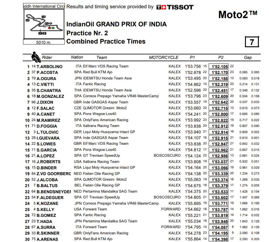 Buone notizie anche da Dennis Foggia, undicesimo. Fuori dai quattordici invece Alonso Lopez, (sedicesimo) per soli 24 millesimi. Ancora più staccato il suo compagno di squadra in SpeedUp, Aldeguer, ventitreesimo.