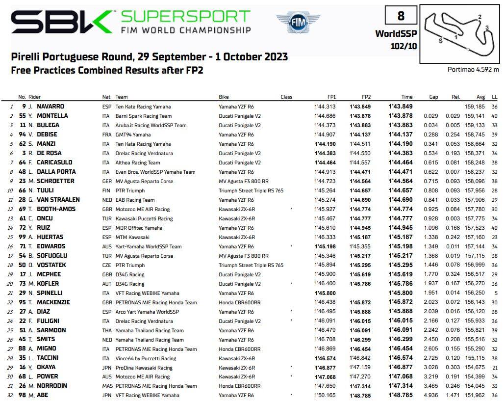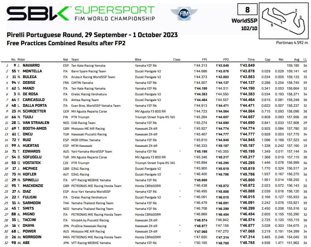 A Portimao le classi Supersport parlano spagnolo. Nella middle class, infatti, è stato a sorpresa Jorge Navarro a siglare il miglior tempo nelle prove libere. Il suo 1’43”849 siglato nelle ultime fasi della FP2 gli consente di stare davanti a Yari Montella e Nicolò Bulega, coi primi tre racchiusi in soli trentaquattro millesimi.