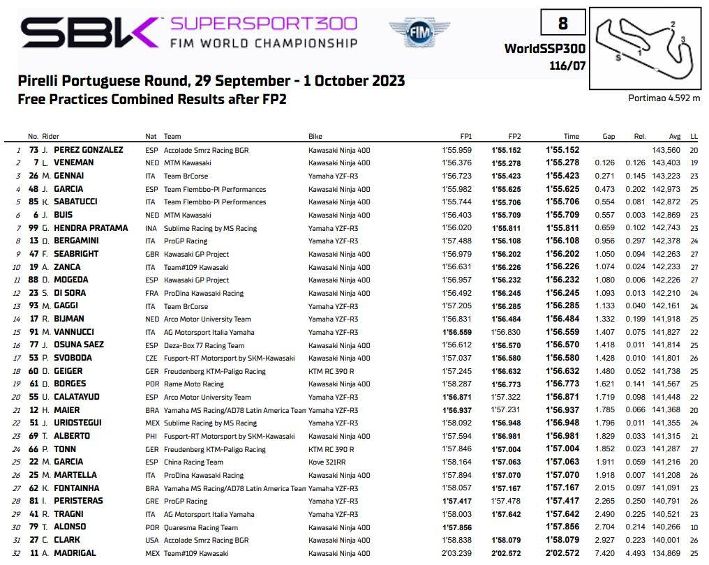 In Supersport 300 miglior tempo in 1’55”152 per José Luis Perez Gonzalez, determinato a restare aggrappato alle residue chanches di titolo. Secondo l’ormai concreto Loris Veneman, terzo posto per il primo degli italiani Mirko Gennai. Bene Julio Garcia, quarto davanti al compagno di squadra Kevin Sabatucci. Ottavo crono per Devis Bergamini, top-10 anche per Alessandro Zanca.