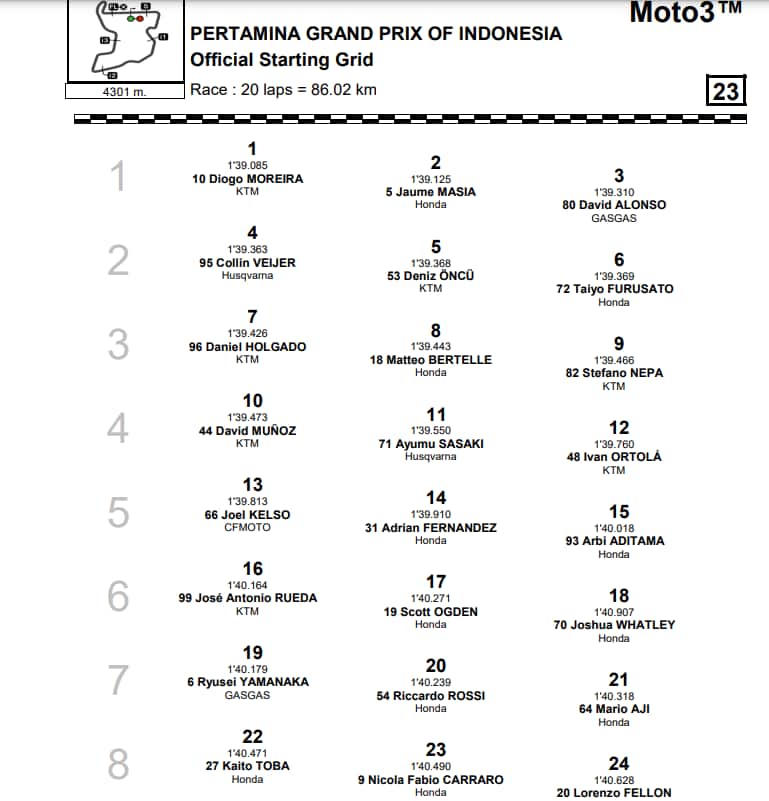 Poteva scalare qualche posizione Matteo Bertelle, migliore degli italiani con l’ottavo posto. Dopo avere seguito a lungo Masia, per sfruttarne la scia, il pilota di Snipers ha sciupato un giro buono nel finale. Alle sue spalle si è classificato Stefano Nepa, la speranza italiana del team Angeluss che porta in gara anche l’ottimo Ortolà, sesto in campionato (per la verità un po’ sotto tono nelle ultime gare) e solo dodicesimo nelle Q2 di sabato. Quarto posto per l’altra rivelazione del campionato, Collin Veijer, 18enne olandese in forza al team Liqui Moly Husqvarna Intact GP, al debutto nel mondiale. Ha preceduto Deniz Oncu, pilota di punta della Ktm Red Bull in Moto3. Il turco viaggia al quinto posto, staccato di 53 punti dalla vetta: nelle ultime uscite ha perso colpi, staccandosi progressivamente dalla lotta al vertice. Un rischio che non può correre Sasaki, in corsa per il titolo, ma il giapponese che nel GP di casa ha centrato il podio, domenica scatterà dalla undicesima casella.