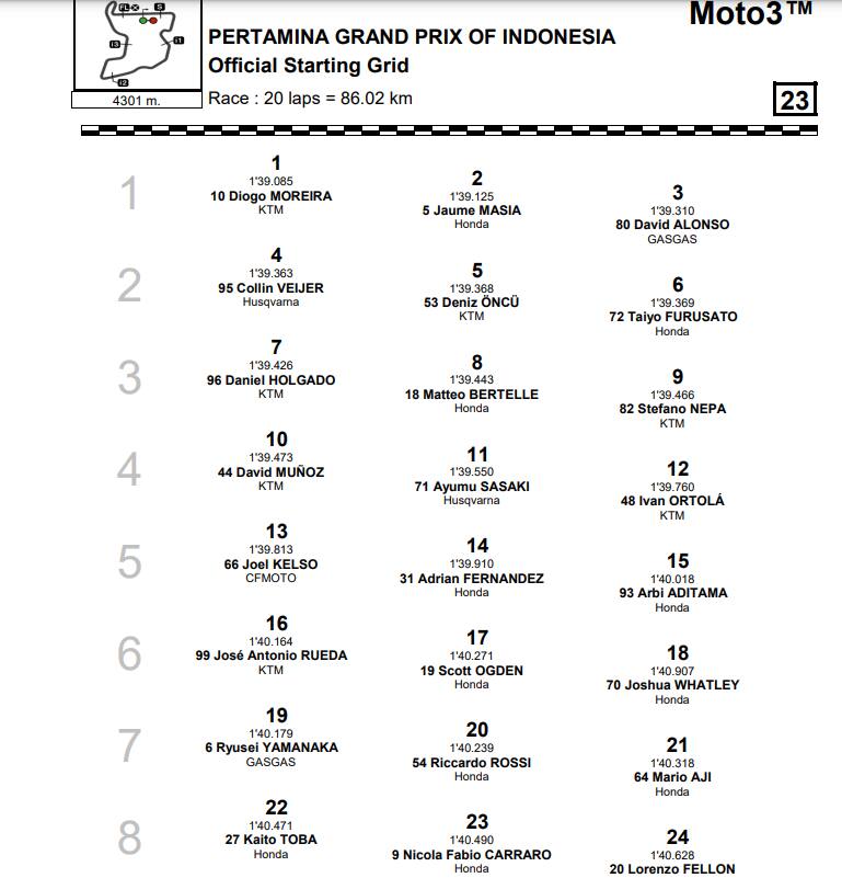 "Stiamo lavorando bene, domani serve concentrazione dal primo giro. Non sarà facile contro Masia e Moreira". David Alonso non sorprende più, il terzo posto alle spalle di Moreira (di cui il colombiano ha sfruttato anche la scia) e del leader del mondiale Masia, secondo, è tra la piacevoli sorprese delle qualifiche di Mandalika. Il giovane rookie lanciato nel mondiale da Aspar Martinez sta concretizzando questa prima esperienza (se non contiamo un paio di wild card corse nel ’21 e ’22), maturando gara dopo gara. Tra Silverstone e Misano ha infilato tre vittorie, in classifica viaggia a 40 punti da Masia, che al momento però fa un altro sport. Lo spagnolo viene da due vittorie di fila precedute da due podi pesanti. Ha acciuffato e superato Holgado, a sua volta passato da Sasaki. La classifica si è accorciata: tre piloti in vetta, racchiusi in 9 punti, con lo spagnolo lanciato come un treno in corsa. In qualifica sembrava soffrire, il pilota di Leopard, poi ha messo la quarta e ha chiuso a 40 millesimi dal brasiliano, che va un po’ a corrente alternata.