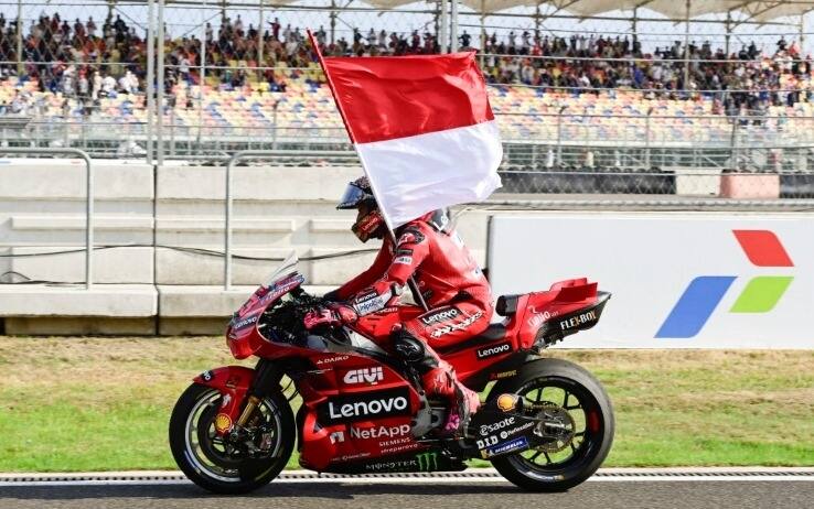 Bastianini sfoggia un casco speciale e sventola la bandiera indonesiana a fine gara
