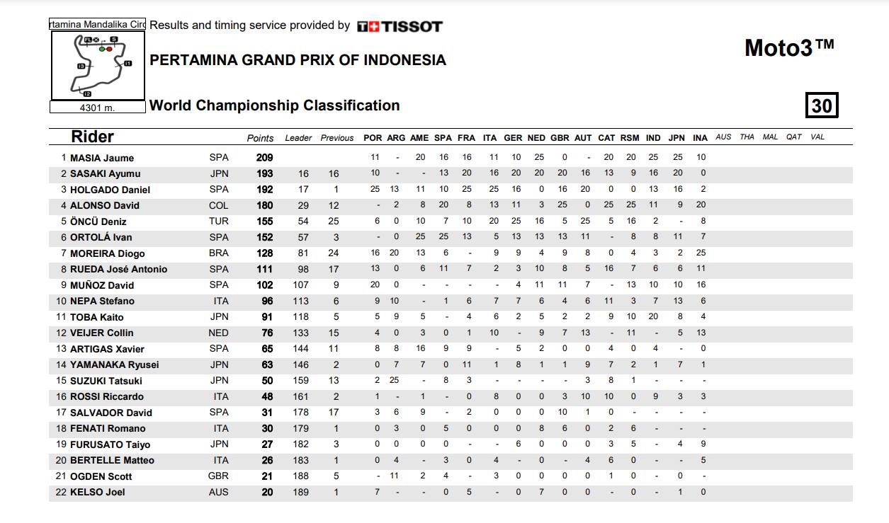 Tra tagli di percorso (Holgado) e sorpassi piuttosto decisi, puntare su un vincente era come azzeccare il 36 alla roulette. Dopo il primo long lap Holgado è rientrato in corsa al decimo posto, a cinque giri dalla fine, ma in breve ha ripreso tutti. Nella foga della rimonta ha commesso un altro errore e al diciannovesimo passaggio ha preso la seconda penalità. Che non ha scontato scegliendo i conseguenti tre secondi da aggiungere. Il pilota di Tech3 ha però chiuso al nono posto e sommandola penalizzazione è scivolato al quattordicesimo posto, guadagnando due soli punti per la classifica che adesso lo vede al terzo posto, alle spalle di Sasaki e a 17 punti da Masia, finito sesto ma quantomeno contento di aver mantenuto il comando del mondiale.