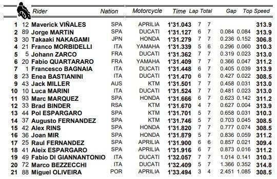 gp indonesiaMaverick Vinales su Aprilia è stato il più veloce nel warm up del GP di Indonesia. Lo spagnolo ha fermato il crono in 1:31.043, precedendo la Ducati di Martin (+0.084) e la Honda di Nakagami (+0.236). Settimo Bagnaia, ottavo Bastianini. Decimo tempo per Marini, 20° per Bezzecchi. Alle 9 la gara in diretta su Sky Sport Uno, Sky Sport MotoGP e in streaming su NOW