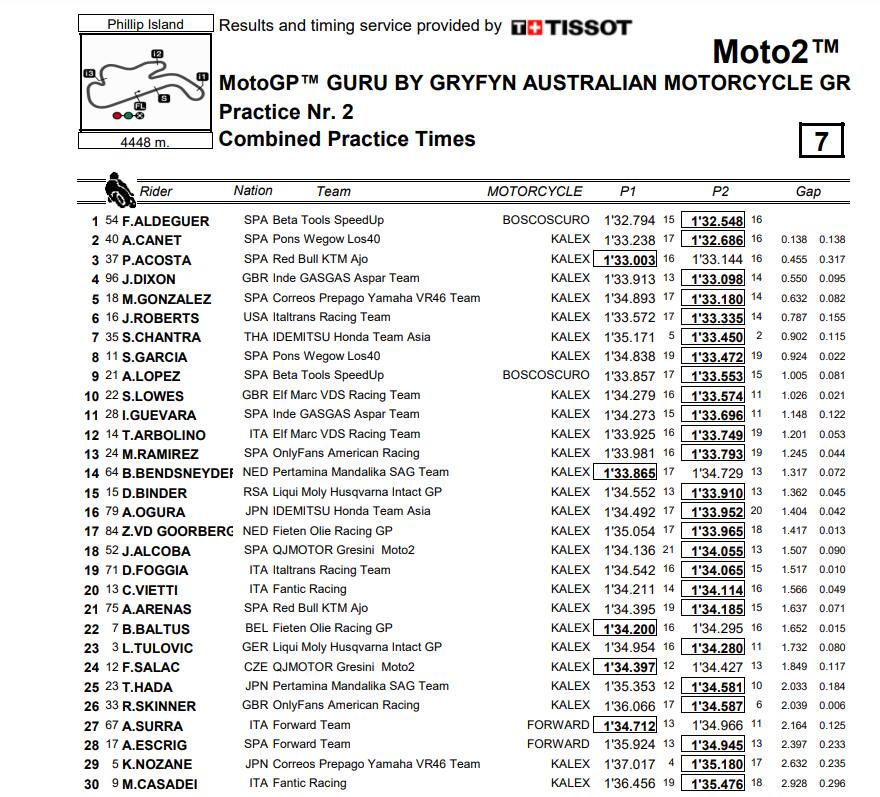 phillip islandFermin Aldeguer è stato il più veloce nelle Libere del venerdì in Moto2, fermando il cronometro a Phillip Island in 1:32.548. Alle sue spalle Canet e Pedro Acosta, che ha fatto segnare il suo miglior tempo di giornata nelle FP1 (nelle Libere 2 è stato protagonista anche di una caduta senza conseguenze). Solo 12° Tony Arbolino, mentre Celestino Vietti chiude col 19° crono