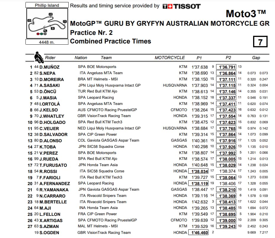Parte bene Stefano Nepa, che si piazza alle spalle di David Munoz al termine della prima giornata di prove in Australia. Tredicesimo al mattino, il pilota del team Angeluss ha scalato la classifica al pomeriggio fermando il cronometro a soli 73 millesimi dalla vetta. Il pilota spagnolo (protagonista di un brutto contatto passibile di approfondimenti da parte dello steward pannel) d’altra parte ha confermato al secondo turno di essere al momento il più veloce sulla pista australiana. Tra i migliori anche il giapponese Sasaki, quarto dopo un buon inizio al mattino. Sesto Jaume Masia, che ha tenuto in apprensione i suo meccanici dopo essersi fermato per un problema tecnico a poco meno di mezz’ora dal termine della sessione finale. Il leader del mondiale ha dovuto riportare la moto al box dove fortunatamente si è scoperto che l’inconveniente (rottura della catena) era facilmente risolvibile. Rientrato in pista a pochi minuti dalla bandiera a scacchi, il pilota di Leopard ha segnato subito al primo giro lanciato il tempo che gli ha permesso di assicurarsi la top ten, davanti ad Holgado. Il suo secondo avversario in classifica (era in testa nella prima metà del campionato) ha chiuso decimo, non benissimo nell’ottica di un duello che lo vede staccato di 17 punti.