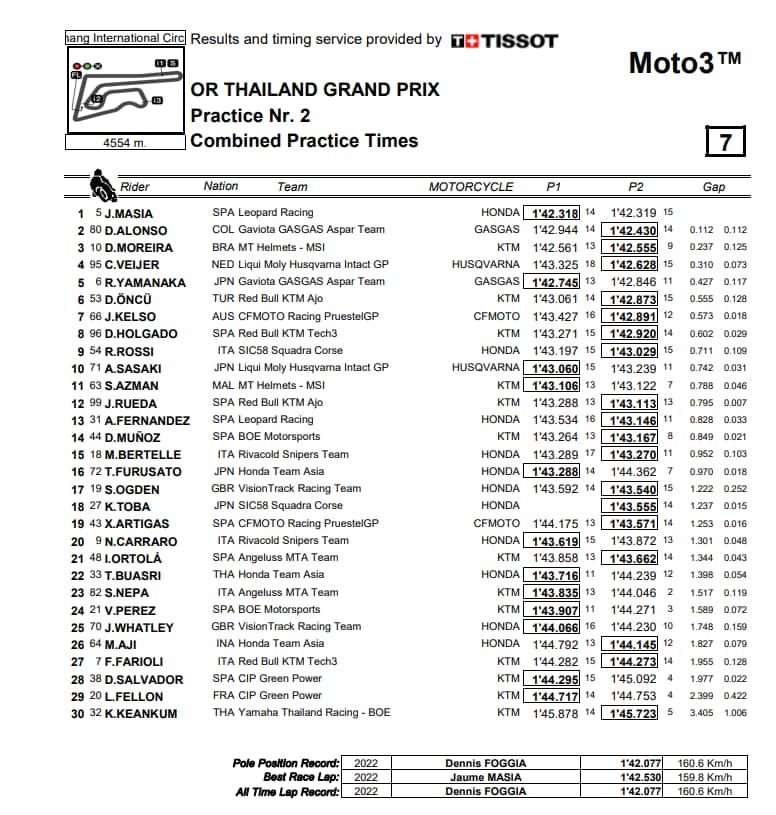 moto3 ©Motorsport.comMasia domina la sessione di prove libere del GP di Thailandia, dimostrando di avere tutte le qualità per puntare alla vittoria del motomondiale. Dietro di lui arriva Alonso, che prende all'ultimo la seconda posizione su Moreira. Sasaki termina 14°, mentre Holgado rimonta dalla 15^ all'8^ posizione