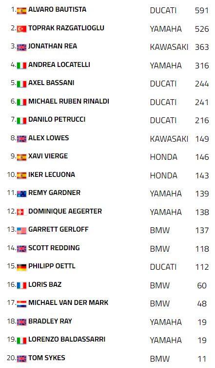 Grande rimonta per Andrea Locatelli, partito decimo e terzo a fine gara, un risultato che gli consegna l’ottavo podio di stagione. Quarta piazza per Jonathan Rea davanti a Danilo Petrucci, sesto Philipp Oettl reo di aver rallentato con un giro d’anticipo sulla fine effettiva della gara. Alex Lowes chiude settimo seguito da Michael Ruben Rinaldi, punito con un long lap penalty per un contatto in fase di sorpasso che avrebbe causato la caduta di Axel Bassani. Le Honda di Iker Lecuona e Xavi Vierge completano la top-10, punti per Lorenzo Baldassarri (12°), ritirato Gabriele Ruiu.