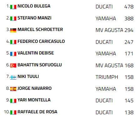 Il podio della corsa parla interamente italiano, perché Stefano Manzi ha battagliato con Federico Caricasulo e lo ha preceduto sul traguardo al secondo posto per soli trentanove millesimi. È la nona volta in stagione che il tricolore avvolge completamente le prime tre posizioni nel campionato Supersport. All’appello, però, è mancato Yari Montella: un contatto al primo giro con Adrian Huertas lo ha spedito a terra procurandogli la frattura del terzo metacarpo della mano sinistra. Per il talento del team Barni la stagione termina con una gara di anticipo.