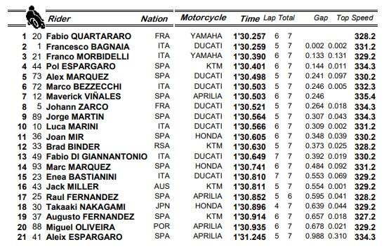GP THAILANDIAQuartararo su Yamaha è stato il più veloce nel warm up del GP di Thailandia con il tempo di 1:30.257 davanti a Bagnaia e Morbidelli , 6° Bezzecchi, 9° Martin (che scatterà dalla pole a Buriram), 10° Marini, 13° Di Giannantonio, 21° Aleix Espargarò. Meteo incerto in vista della gara, in diretta dalle 9 su Sky Sport Uno, Sky Sport MotoGP e in streaming su NOW