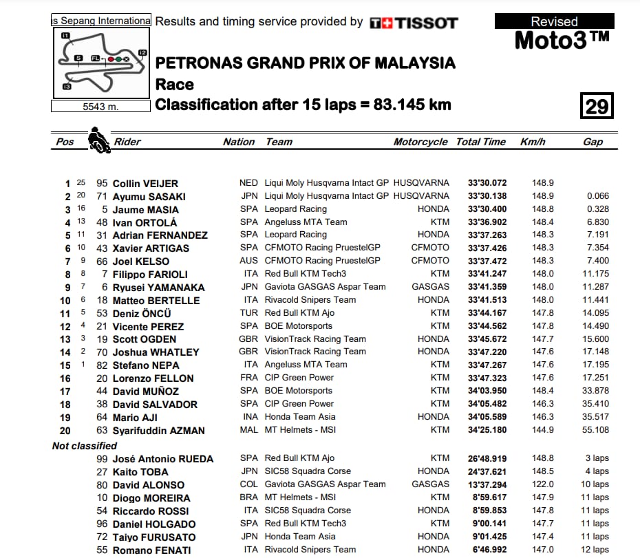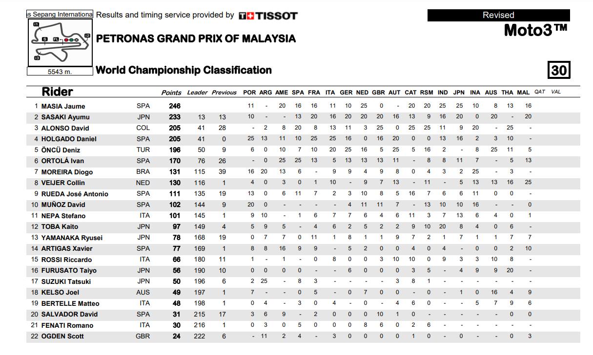 Polemiche a parte - se Veijer avesse favorito Sasaki, la distanza da Masia si sarebbe ridotta a 8 lunghezze - la lotta per il titolo ha subito un duro colpo al quinto giro quando Alonso, partito ventunesimo e risalito fino al decimo posto, ha innescato una carambola in cui sono rimasti coinvolti Moreira, Rossi. Furusato e Holgado. Caduta senza conseguenze per nessuno, nonostante la sequenza drammatica (Alonso è rimasto sulla pista rischiando di essere travolto), se non per la classifica. Il colombiano ha lasciato sull’asfalto malese i suoi sogni di lottare ancora per il titolo, al primo anno di Moto3, nonostante l’aritmetica lasci ancora aperte le sue speranza, ma 41 punti di ritardo (ne aveva 25 prima del via) sono tanti con solo due gare da disputare.